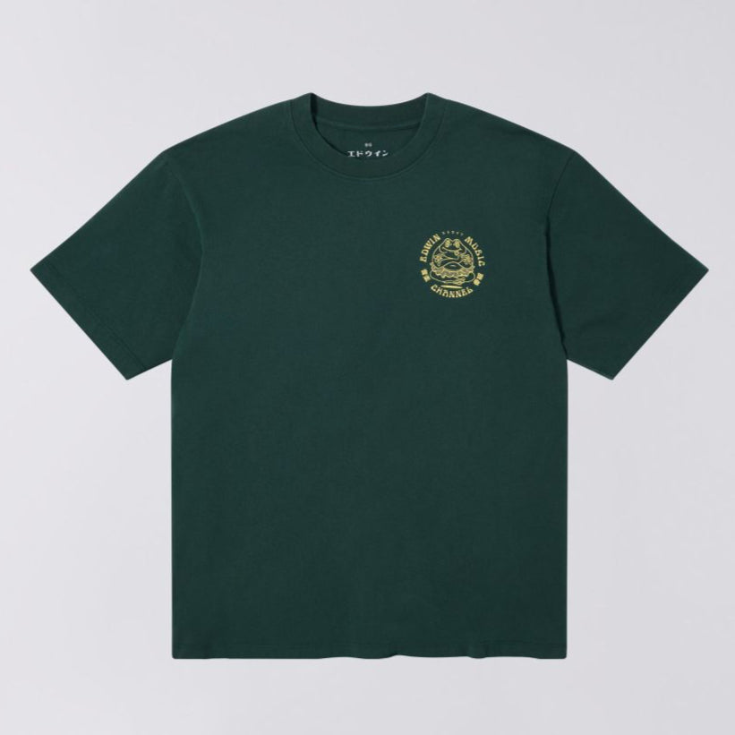 The EDWIN Music Channel T-Shirt is made from 160g/m² single jersey, 100% cotton. It features an oversized fit, graphic prints on both chest and back, and a ribbed collar for added durability and structure.