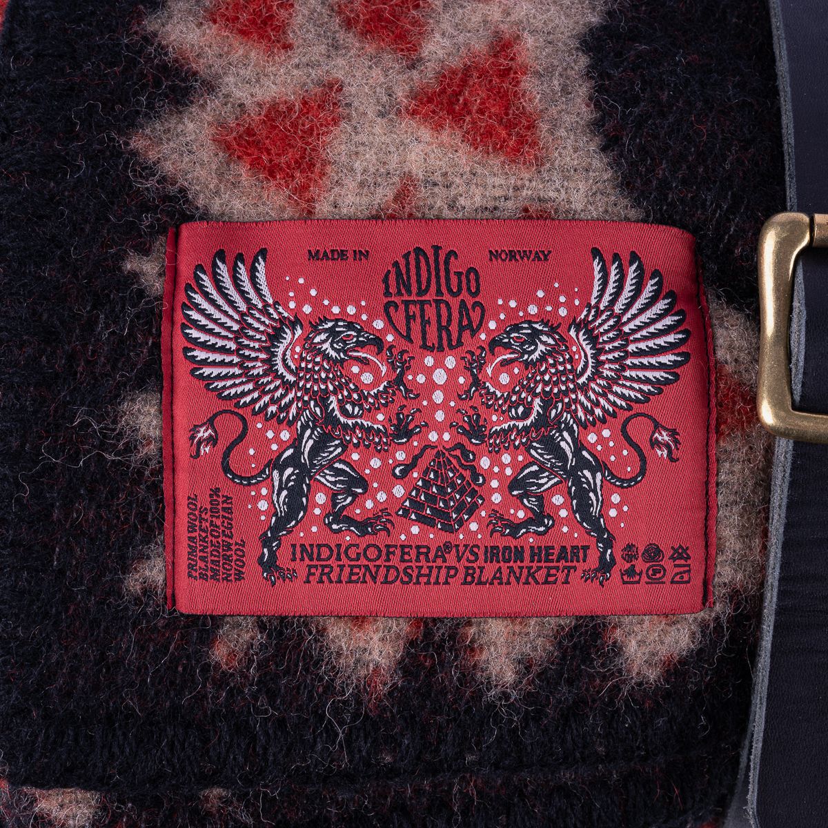 Featuring a design by acclaimed artist Björn Atldax, this 2m x 1.5m blanket is an exclusive collaboration between Iron Heart and Indigofera. Aptly named the "Friendship" blanket to celebrate the unique partnership between the two brands, it is crafted in Norway from 100% wool and comes with a stylish leather and denim buckled carry strap, made by Iron Heart in Japan.