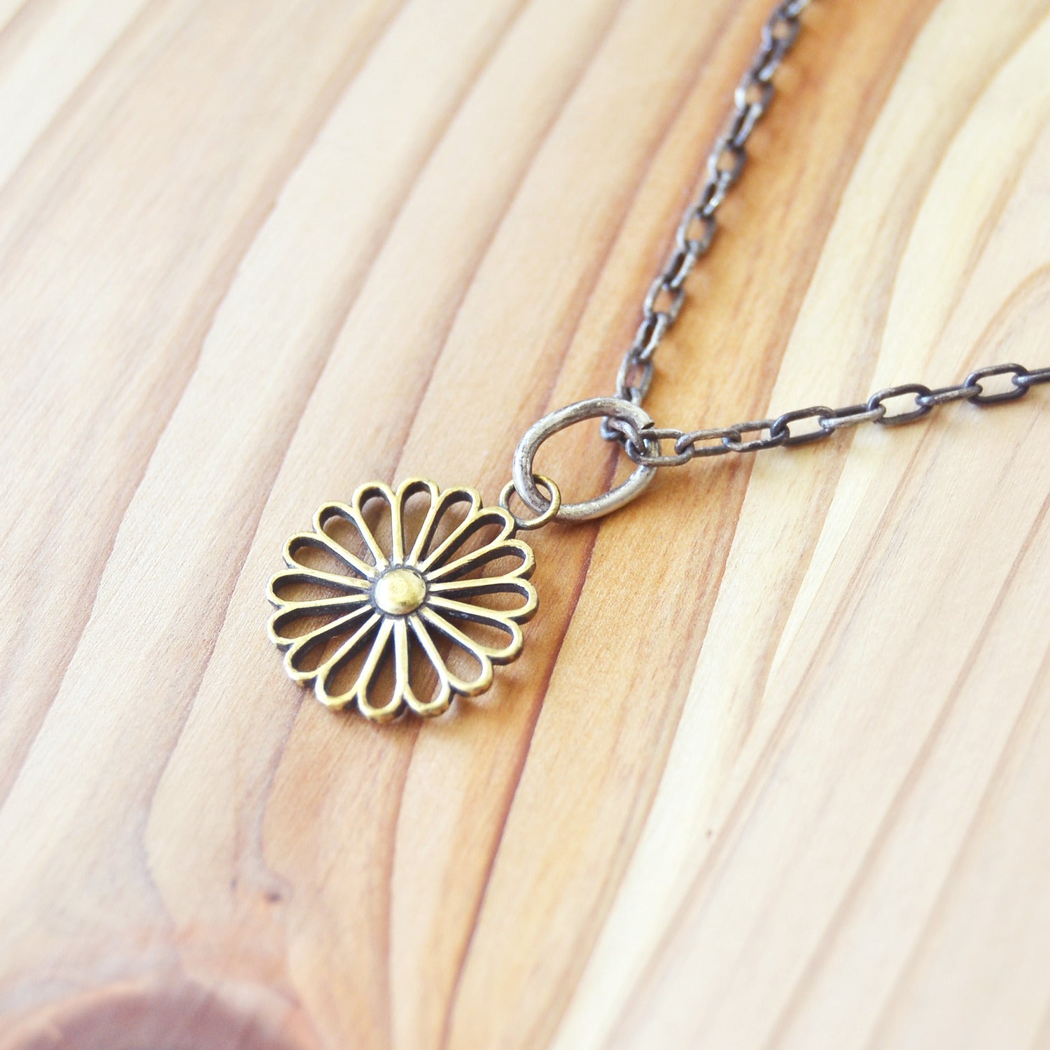 Authentic Japanese Kikumon charm featuring traditional 16-petal design in medium 16mm solid brass with distinctive "Sukashi" (openwork) styling.