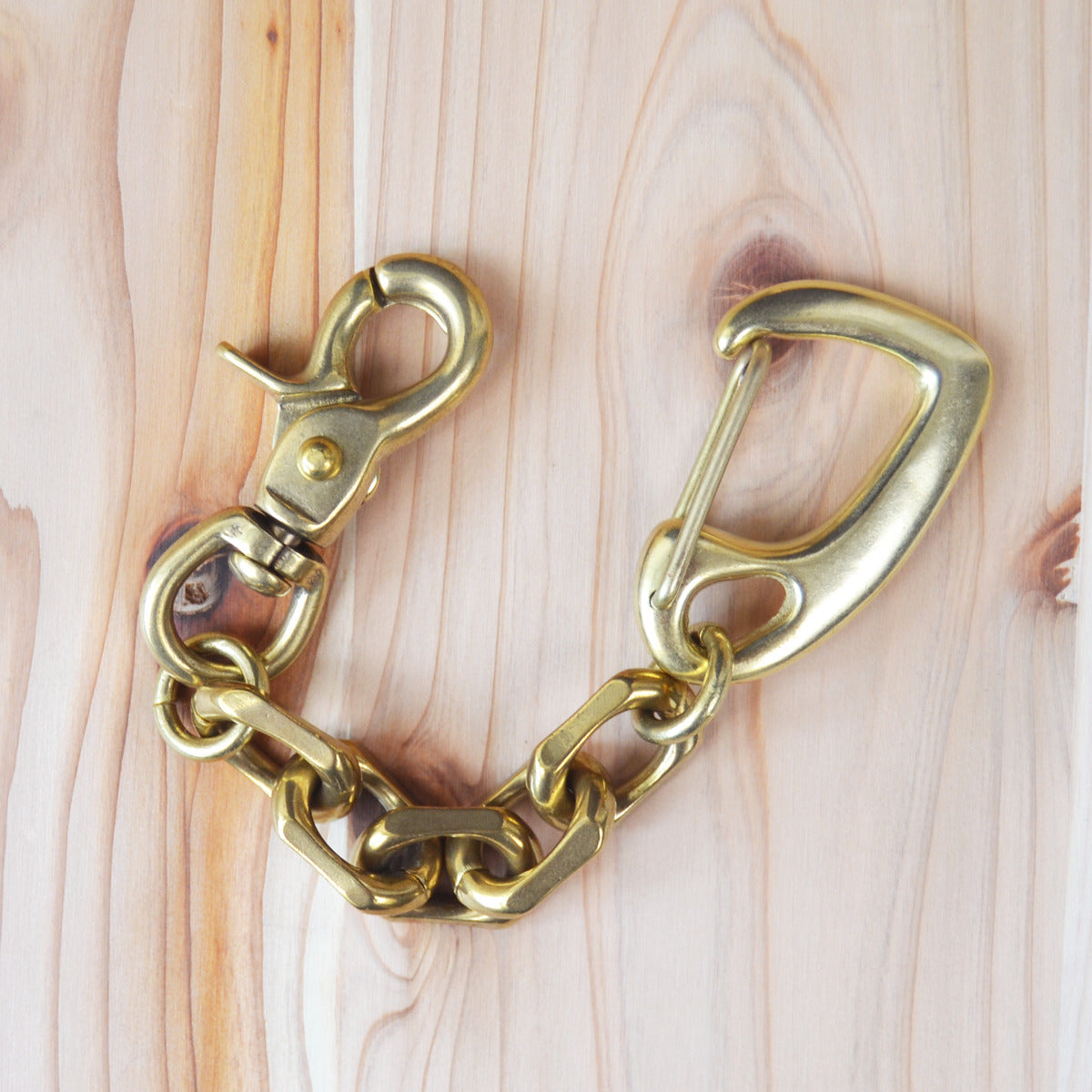 Sand casted snap and 2cut edge the heaviest massive oval chain with a lever snap. A rotating lever snap can prevent the key bundle from twisting and easy to release connected rings. Handmade sand casted lever snap parts are individually assembled by foot in an old press at a family operated foundry established in 1958. Only the spring lever is made of steel and plated in solid brass color. Comes with a wax paper envelope.