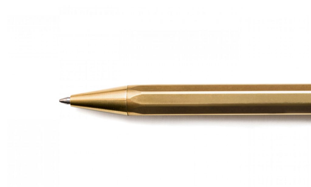 This sturdy 35 gram ballpoint pen is carved (milled) from a single piece of solid brass using CNC technology. The polished surface features a temporary non-tarnishing finish. The finish gradually disappears after a few days of use, but can also be buffed away with a soft cloth.
