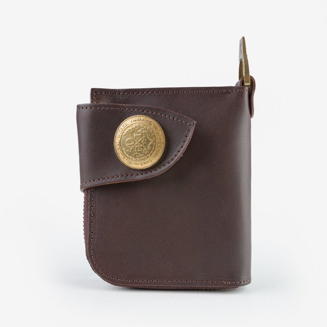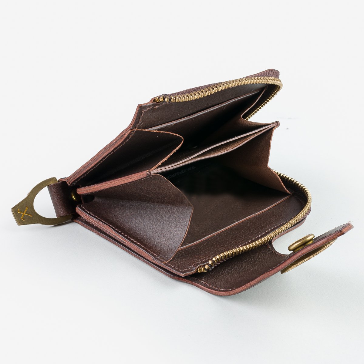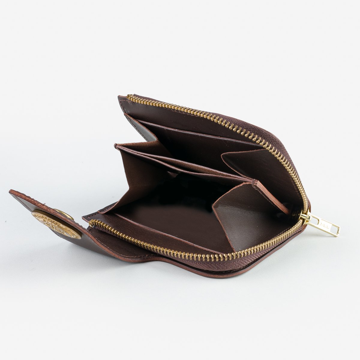 This is a short-sized leather zipper wallet. Incorporating the Concho design of native-american style, zipper is added to this popular short wallet. Internally is also modified to half-open accordian design.