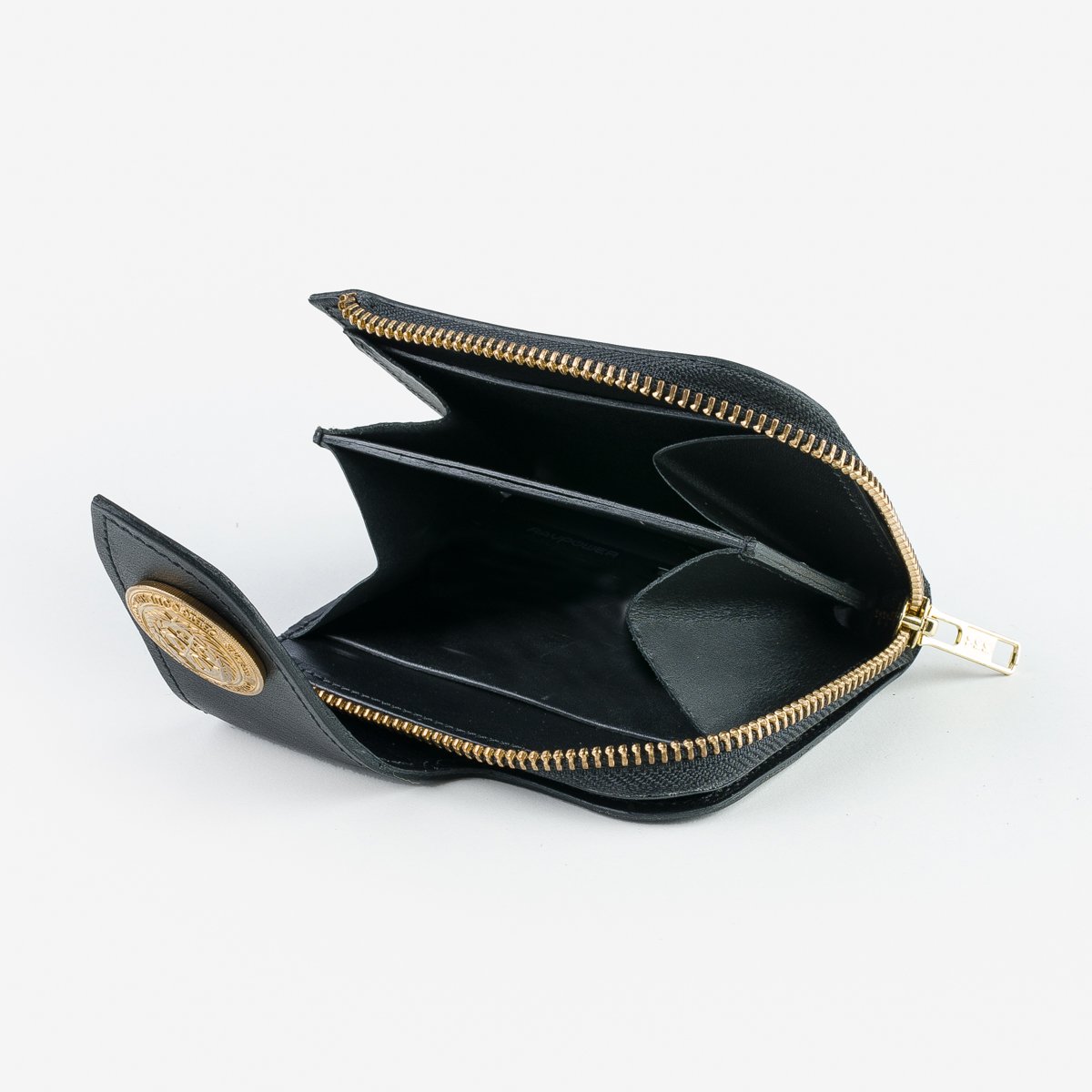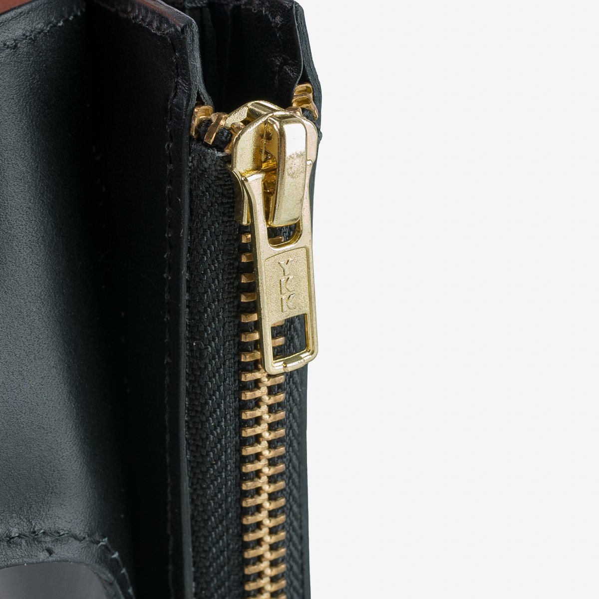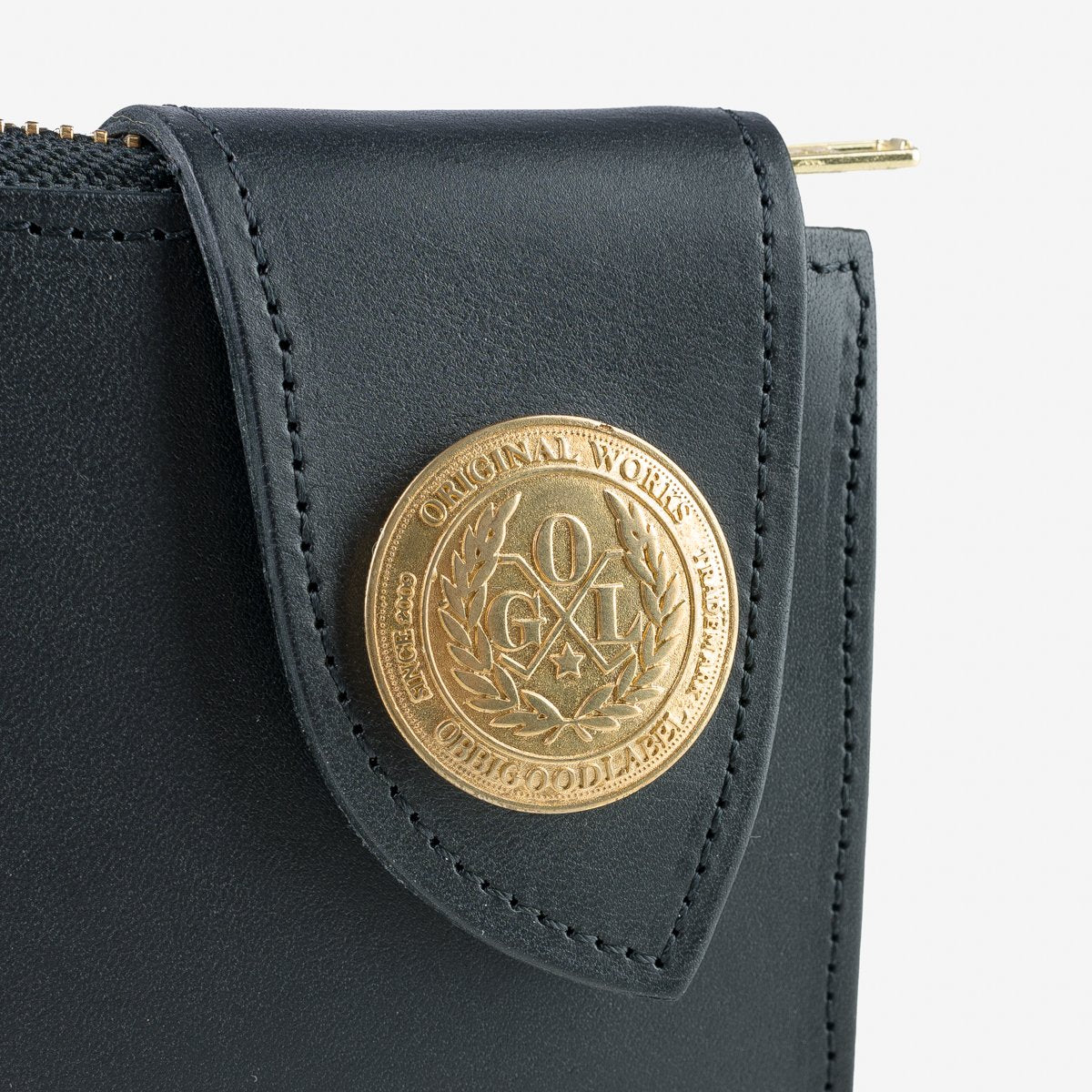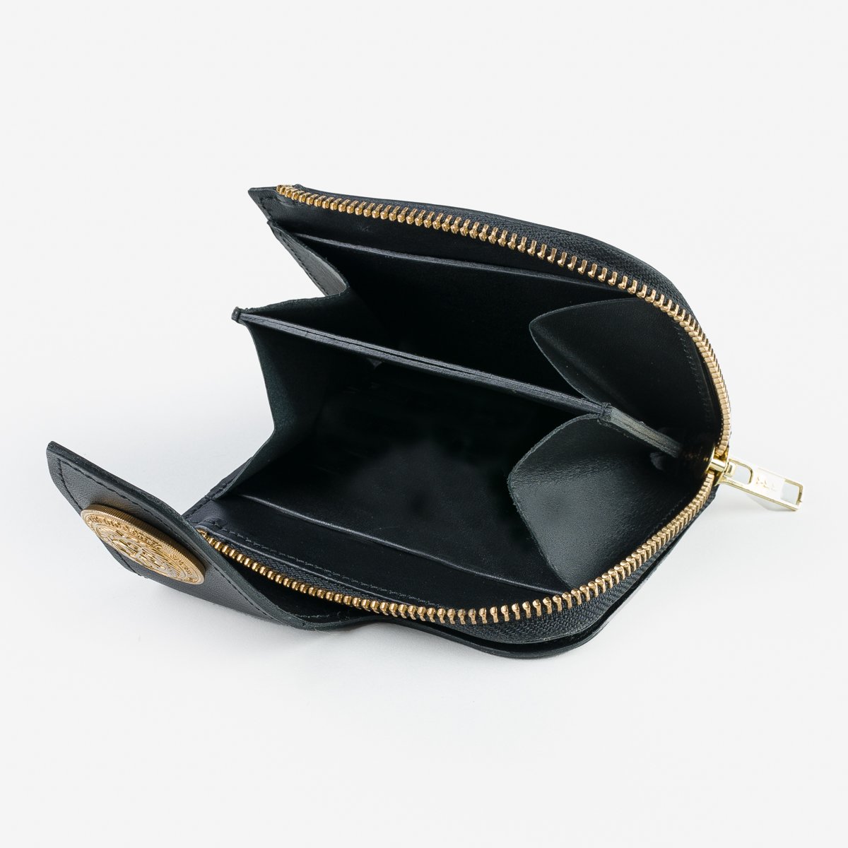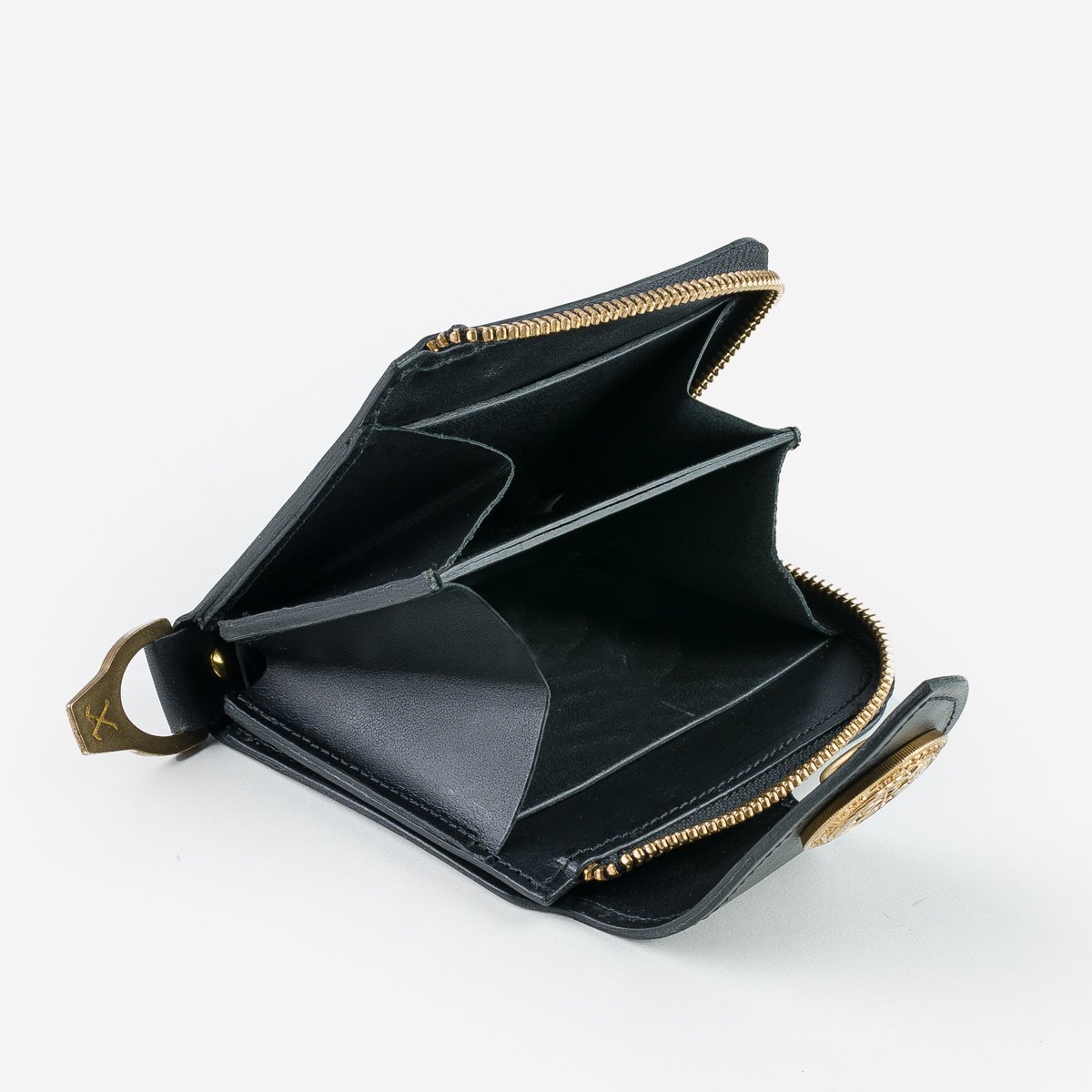 This is a short-sized leather zipper wallet. Incorporating the Concho design of native-american style, zipper is added to this popular short wallet. Internally is also modified to half-open accordian design.