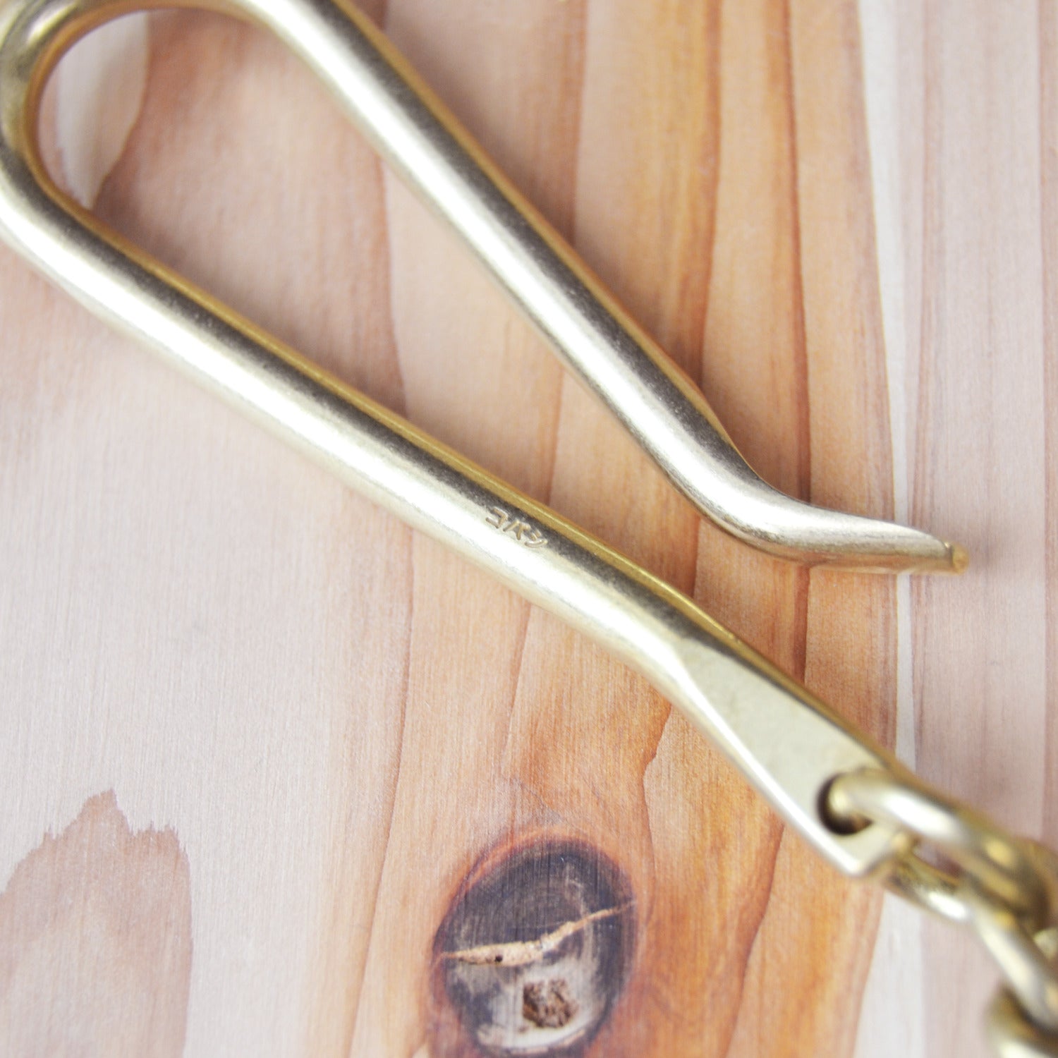 Handmade key hook with vintage feel twist chain with a double ring. Optional middle: 53cm. Key hook is made entirely from 5 mm brass rods one by one, engraved Kobashi Japanese letters. The chain is woven by a master machine operator with old chain-making machine from more than 50 years ago, and is specially barrel polished by a polisher in Saitama to create a original brass color. The ring and double rings are manufactured by a hardware supplier founded in the early 1900s. The hooks are angled to fit the body beautifully. 100% solid brass. Comes with wax paper envelope.