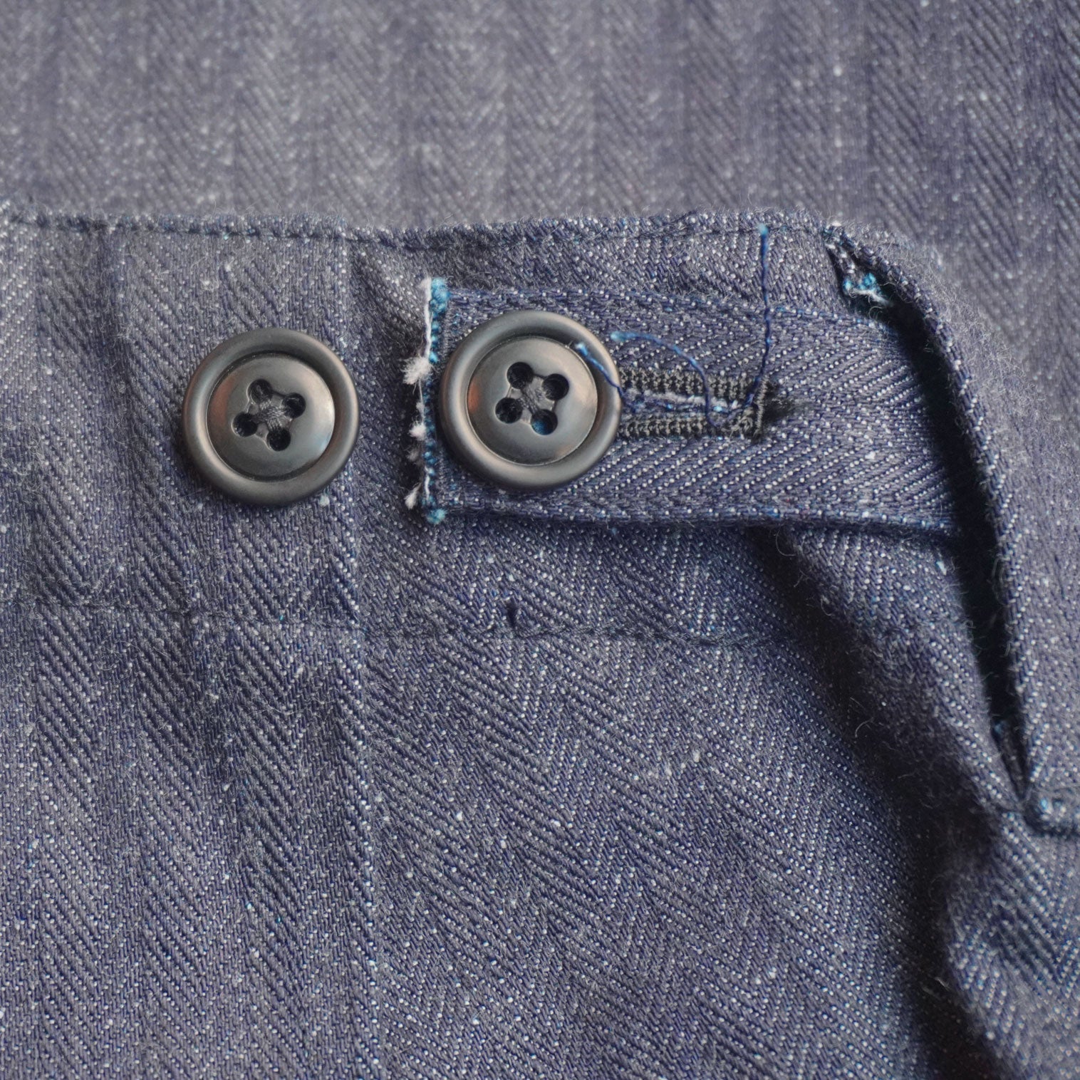 These wide pants are crafted from an authentic 13oz SWC original herringbone denim, combining three colors: indigo, black, and oatmeal, with gray yarn woven into the weft.